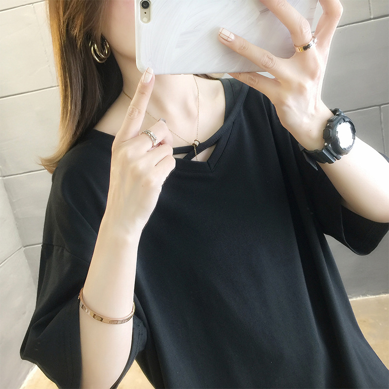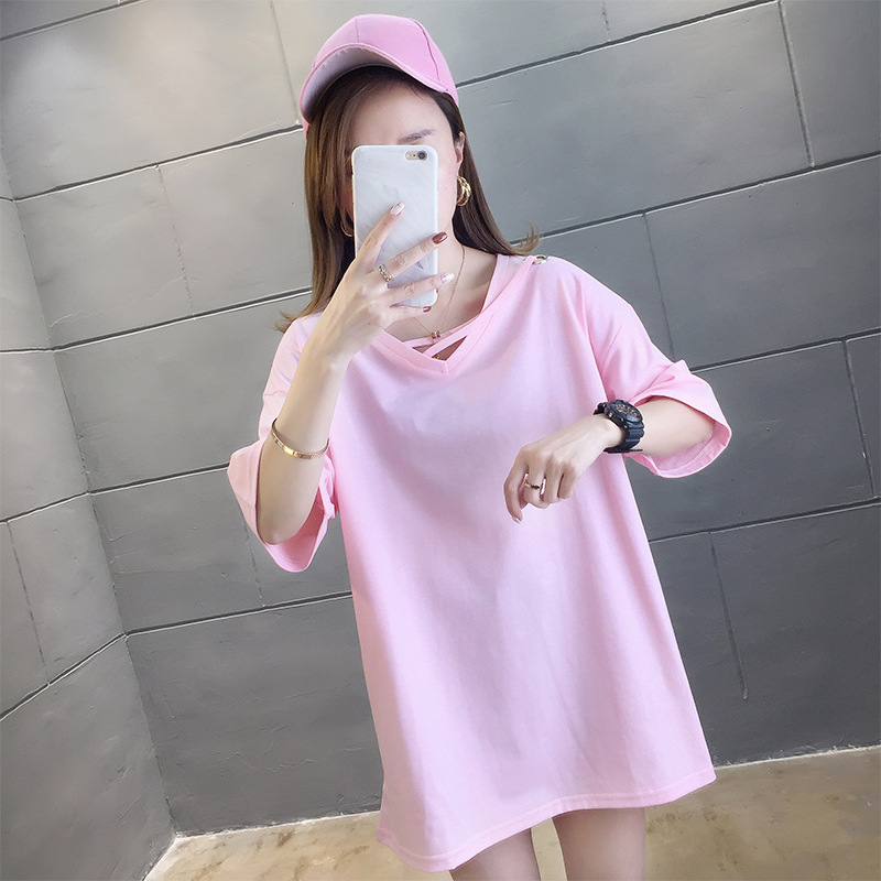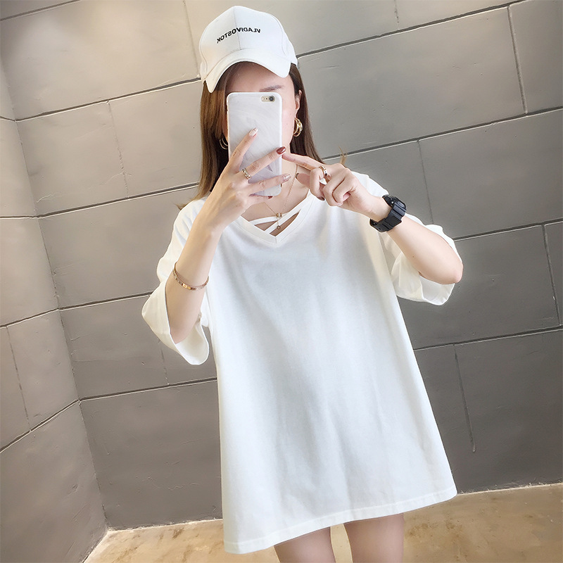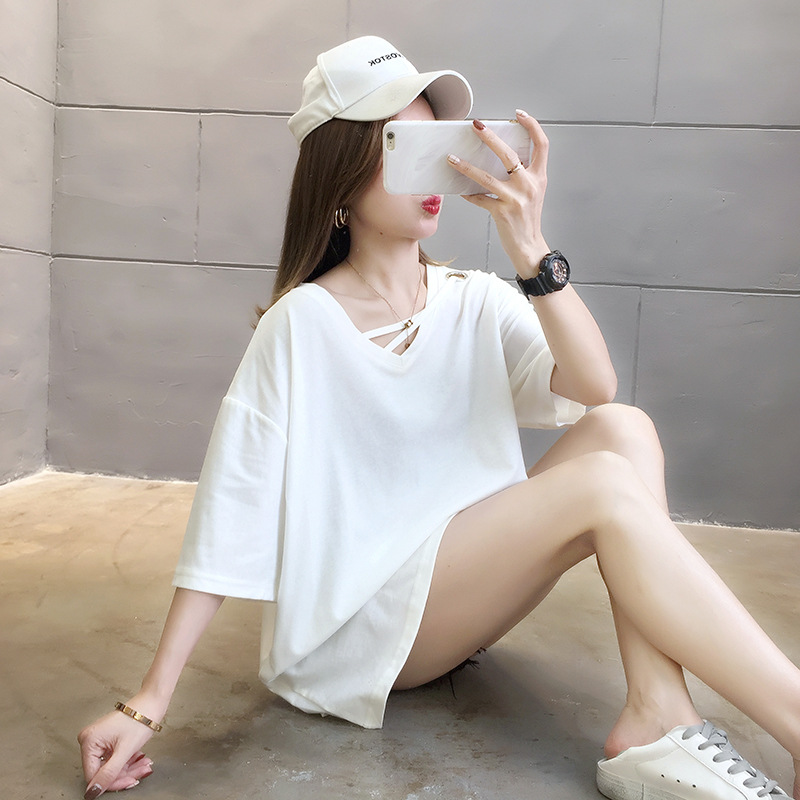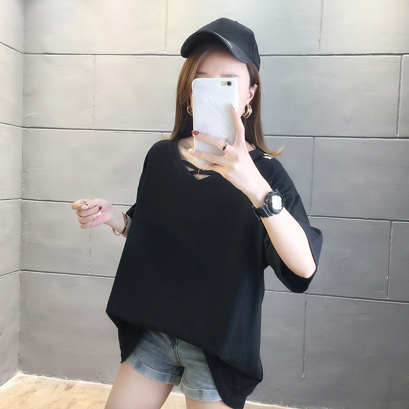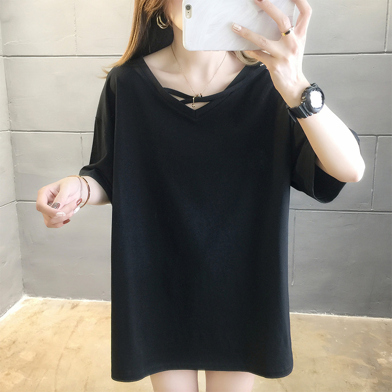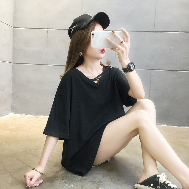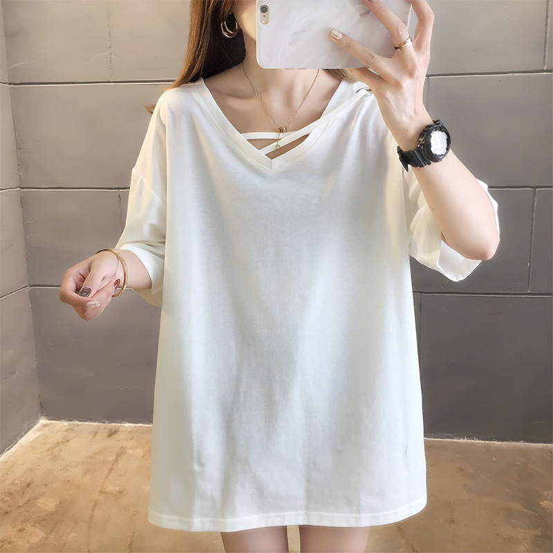 Women's Summer College Korean Style V-Neck Loose T-Shirt with Pure Color